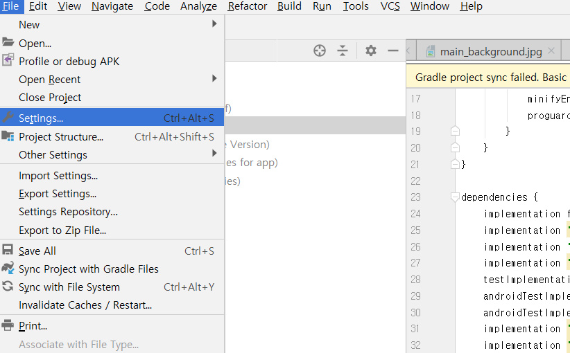 우선 Android Studio - File - Settings 경로로 들어가 보자