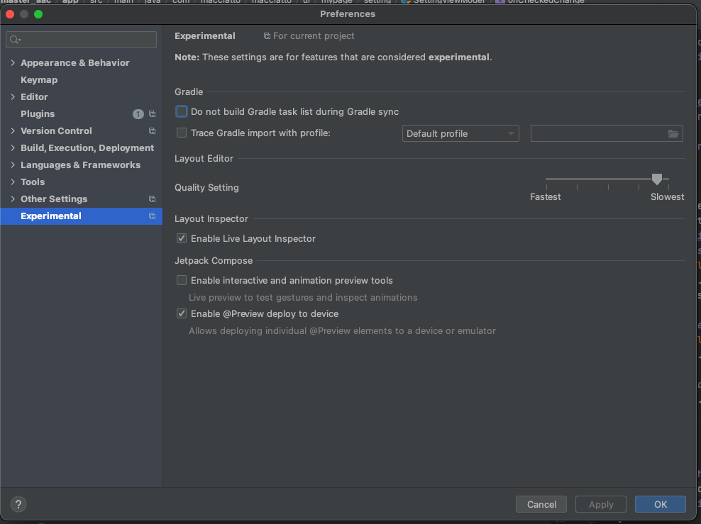 1. 설정의 Do not build Gradle task list during Gradle sync 체크 해제